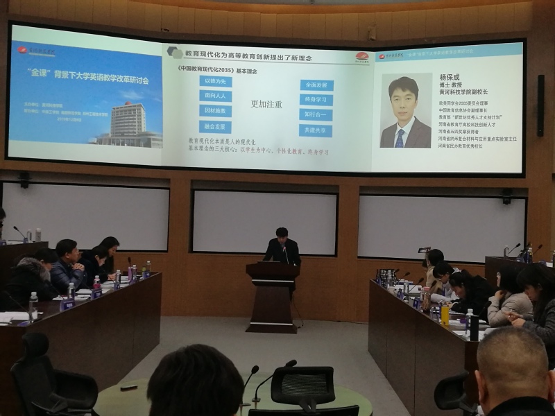 2019年12月8日,应黄河科技学院的邀请,我校基础部主任万华教授携我校大学英语教学改革团队成员代表:基础英语教研室主任米法利老师、英语教师段梦梦老师以及国际交流处费红枫老师一同前去交流学习。除去黄河科技学院公共外语教学部全体教师以及翻转外语技术团队,共有36所学校参加此次研讨会。
